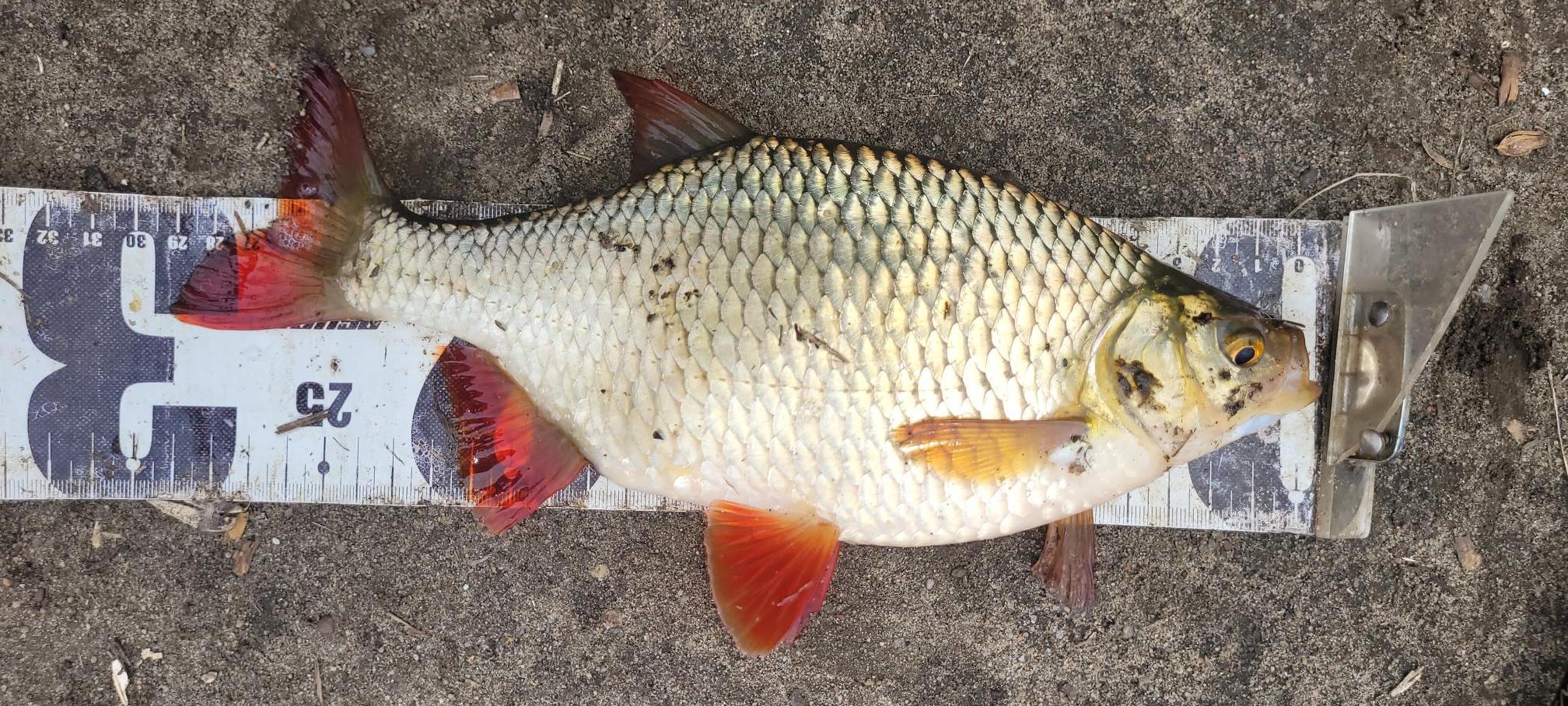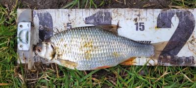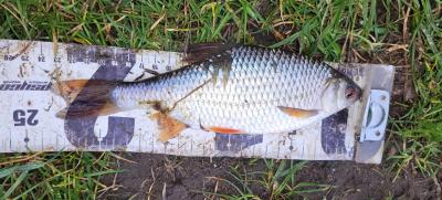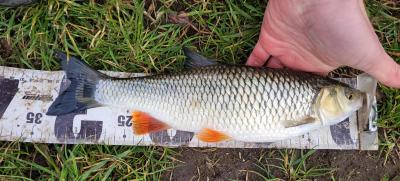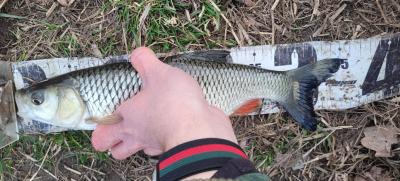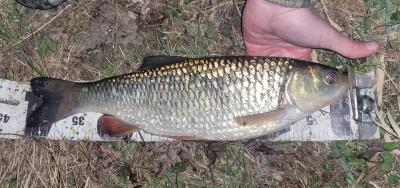 Gatunek ryby: kleń - Długość w cm: 34 - Data połowu: 21-03-2026 - Godzina połowu: ok. 08:41 - Łowisko: kanał Odry - Przynęta: makaron kolanka - Opis: przepływanka w prawie stojącej wodzie. Tabuny uklejek i trochę płoci. Tego dnia brania słabe. Jedyny bonus tego dnia. -