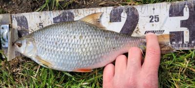 Gatunek ryby: płocie - Długość w cm: 23; 28; 24,5; 20,5 - Data połowu: 21-03-2026 - Godzina połowu: ok. 06:00-11:00 - Łowisko: kanał Odry - Przynęta: pinka, pęczak - Opis: przepływanka w prawie stojącej wodzie. Tabuny uklejek i trochę płoci. Tego dnia brania słabe. -