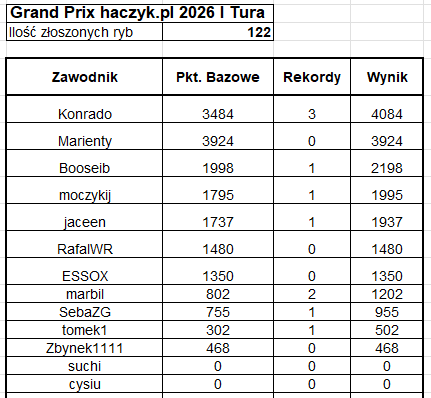Grand Prix haczyk.pl 2026- klasyfikacja I Tura
