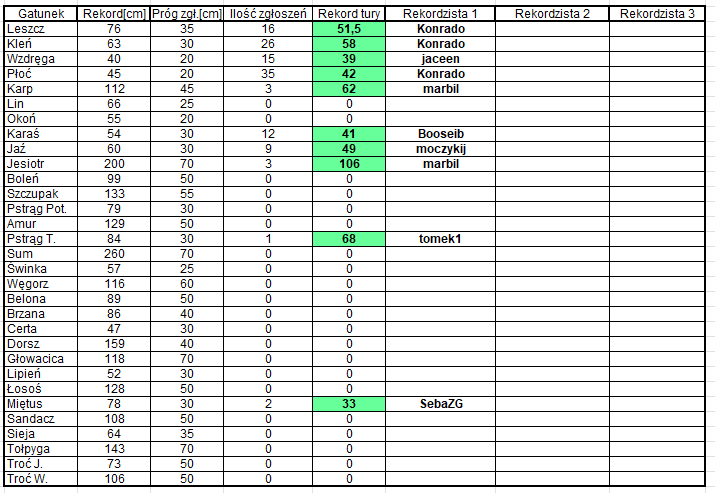Wybrałem się w niedzielę na przepływankę, nad Odrę. Niestety tego dnia rzeka mnie pokonała. Wybrałem odcinek ze zbyt szybko płynącą wodą i miałem tego dnia za lekki zestaw. Kleń był do tej pory największą rybą jaką złowiłem na bolonkę 6m. Na tak długą wędką taka ryba to zupełnie inne doznanie. Łowiłem na makaron. Na pinkę i pęczak złowiłem jeszcze parę uklejek. Podmieniam 42 na 45cm. 1. Konrado 58; 55,5; 55; 54,5; 51; 50; 49; 49; 47; 47 2. suchi 41,5; 47,5 3. jaceen 50, 48 4. moczykij 45,5; 44; 46; 41; 46,5; 48, 52; 39, 40; 44 5. Marienty 44; 45; 44.5 6. SebaZG 30; 41,5; 30; 32 7. Tymon 54 8. jamnick85 49; 38,5